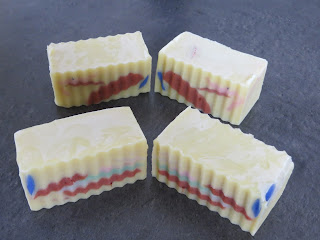 Un denier savon avant la fin de l'année, toujours la même recette. J'ai à nouveau utilisé mon moule à cloisons pour réaliser un marbrage, comme fait par ici, par là ou encore là.