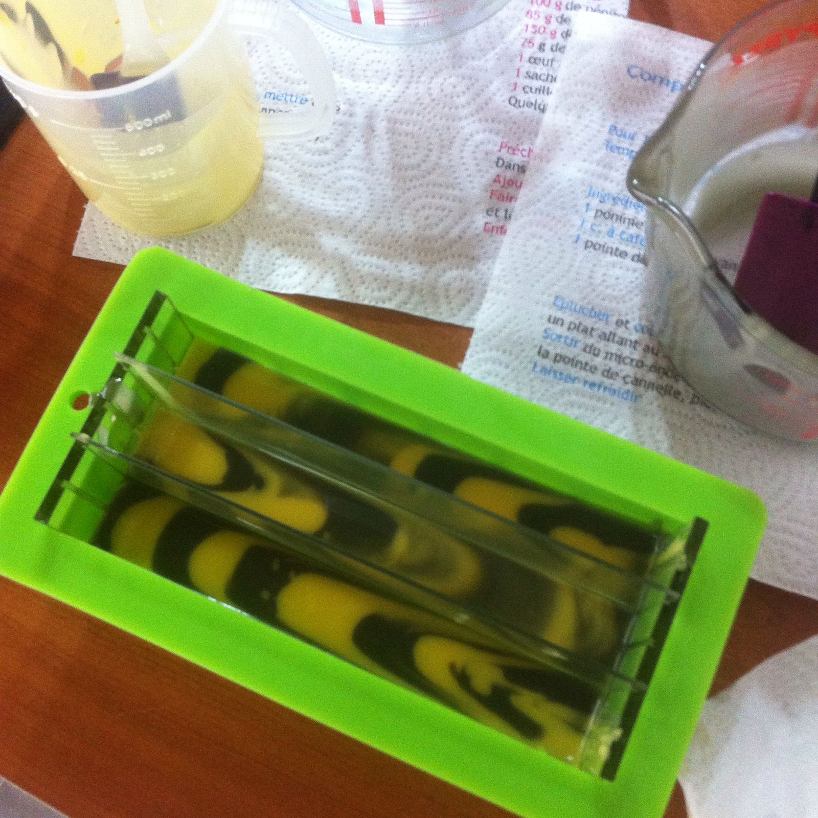 Ci-dessous la photo après avoir écoulé toute la pâte, comme vous pouvez le constater, j'ai un peu bâclé la fin mais pour tout vous dire, le téléphone a sonné PILE quand j'étais en plein milieu de mon marbrage, j'ai grogné un "mais c'est vraiment pas le moment !" tout en me dépêchant quand même. Tout ça pour arriver trop tard au téléphone... la prochaine fois, je laisse sonner, tant pis, mon savon d'abord !